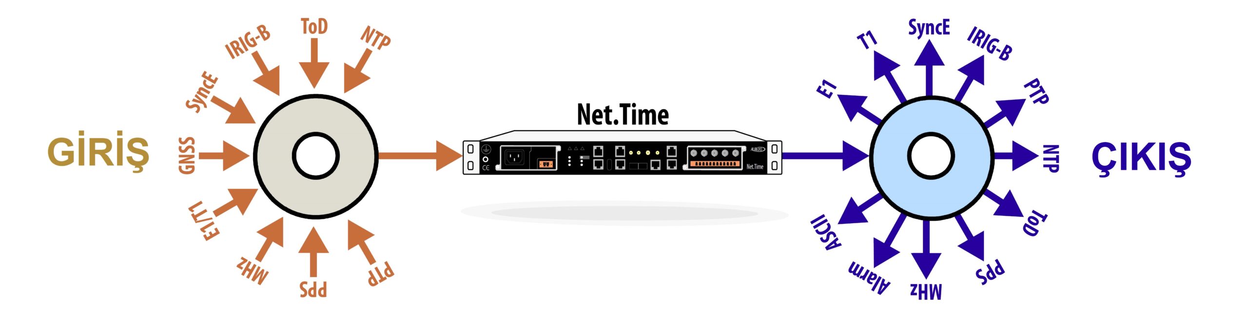 Net.Time, PTP, NTP, SyncE, ToD, IRIG-B, PPS, T1, E1 ve MHz dahil olmak üzere çok çeşitli zamanlama sinyallerini dağıtmak için Ana (Master), Sınır (Boundary) ve Bağımlı (Slave) saat olarak yapılandırılabilen bir PTP / NTP cihazıdır. Net.Time, bekleme durumunda en yüksek zaman doğruluğunu sağlamak için bir atomik Rubidyum osilatörü ile donatılmıştır, OCXO ayrıca kilitli modda mükemmel bir zaman kararlılığı sağlamak için değerli bir seçenektir. Net.Time, iç devreleri disipline etmek için çoklu saat referanslarını kabul ettiği için gerçekten çok esnektir. GNSS varsayılan ve en belirgin referanstır ancak PTP, NTP, SyncE, ToD ve IRIG-B gibi sinyaller de ana referans girişleri olarak kullanılabilir ve hiyerarşik bir şekilde etkinleştirilebilir.
