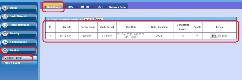 - SIM kartlarına ilişkin veri kullanım bilgileri cihaz web arayüzünden ayrı ayrı grafik olarak izlenebilir, izleme aralığı olarak saat, gün seçilebilir.