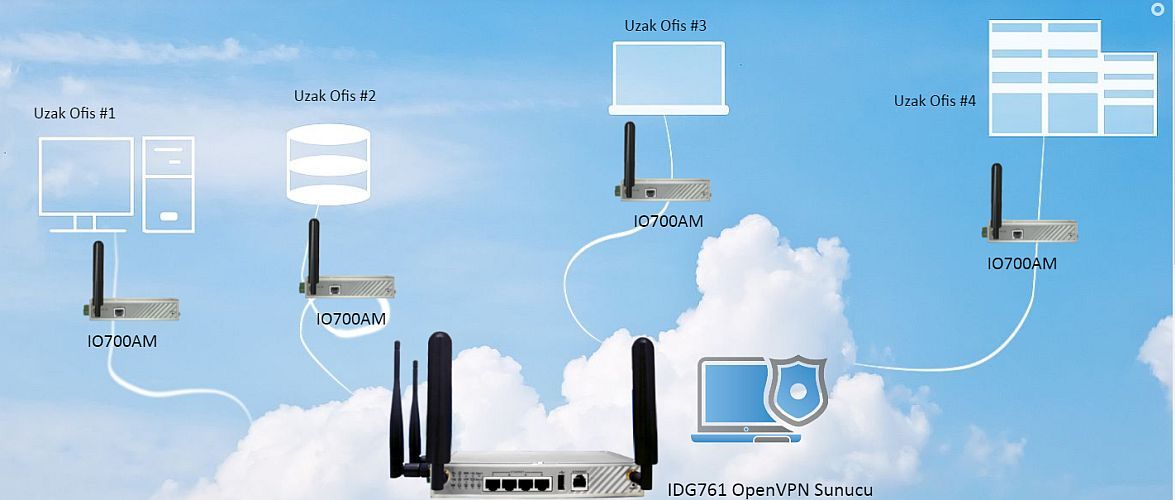 OpenVPN Sunucu desteğine sahip cihaz 16 uzak bağlantı (OpenVPN İstemci) desteği ile düşük maaliyetli, güvenilir 4G VPN ağ sistemlerinin oluşturulmasına olanak sağlar. Sadece, 4G bağlantısını oluşturup aynı anda OpenVPN Sunucusu olarak çalışacak IDG761AM cihazına sabit IP adresine sahip bir SIM kartının takılması yeterlidir. Uzaktan bağlanacak OpenVPN İstemci cihazlarının üzerindeki SIM kartları dinamik IP adres özelliği ile sorunsuzca merkeze bağlanıp, güvenli VPN tünellerini oluşturabilirler.