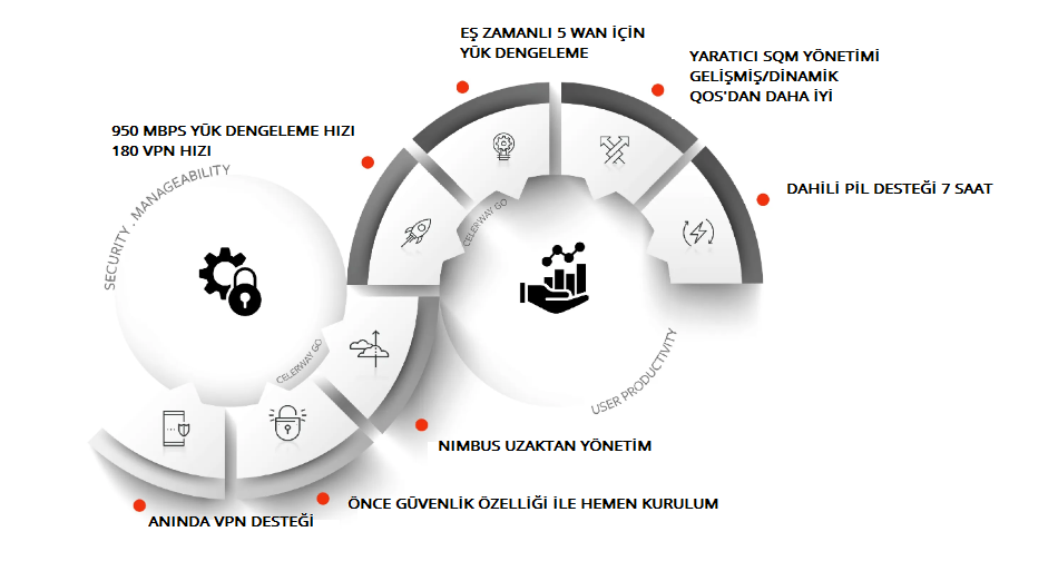 Celerway GO, elinize veya bir dizüstü bilgisayar çantasına sığacak kadar küçük olmasının yanında neredeyse her yerde VPN şifrelemeli Gigabit sınıfı bağlantı sağlayan tek taşınabilir, pille çalışan mobil yönlendiricidir.