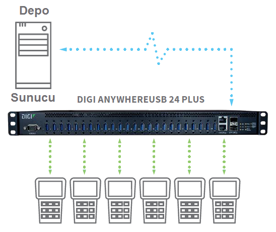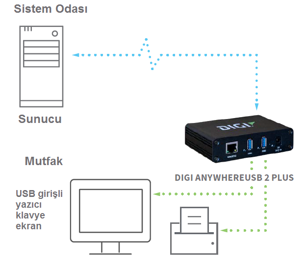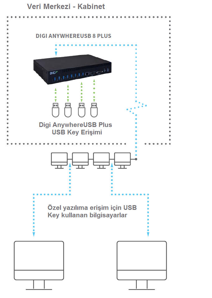 Digi AnywhereUSB Plus uzaktan bağlantı hub cihazları, USB cihazlarınızı USB kablo sınırlarından bağımsız olarak yönetmenize olanak sağlar. Bilgisayarlar merkezde toplanabilir, sanallaştırılabilir, kabinetlere konularak çalışma alanları düzenlenebilir, güvenlik ve sürekli yönetim sağlanır.