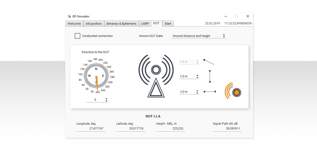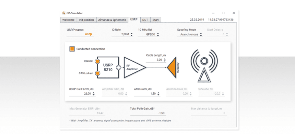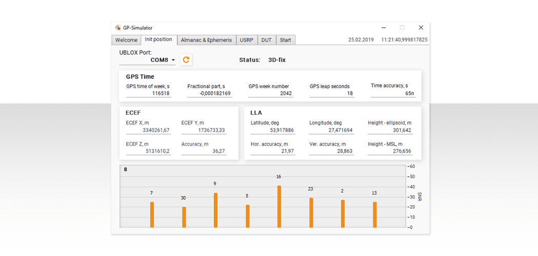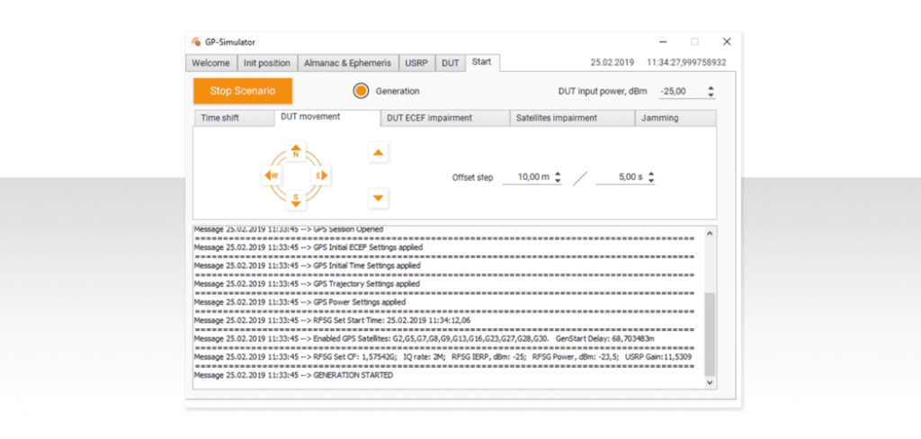 Uygulama, zaman damgası, PPS fazı, koordinatlar ve bireysel uydu parametrelerinin gerçek zamanlı manipülasyonunu sağlar. Gerçek sinyallerin davranışını simüle etmek için bozulmalar uygulanabilir.