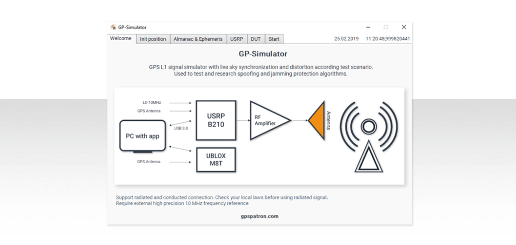 GP-Simulator, NASA web sitelerinden gerçek Almanac ve Ephemeris dosyalarını alarak, kullanır. Böylelikle temel sahtekarlık koruma algoritmalarına sahip bir alıcıya gerçekçi, başarılı bir saldırı başlatılır.