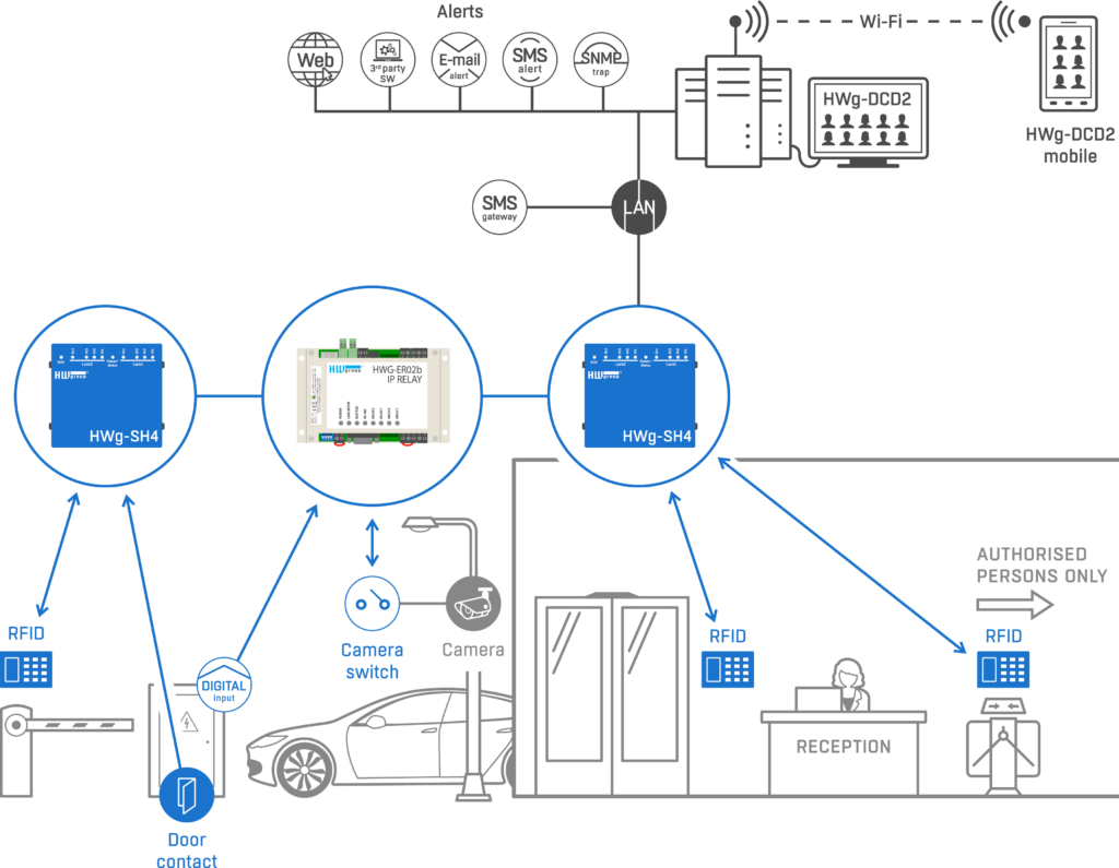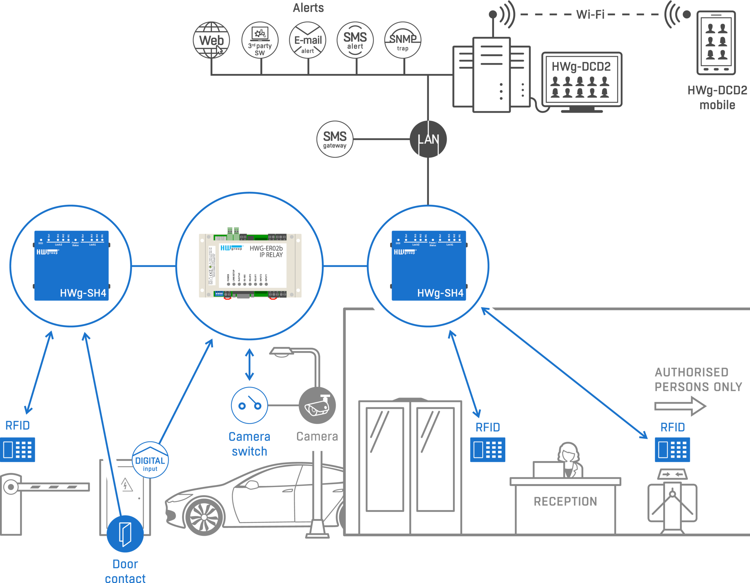 HWg-SH4 çözümü ile erişim kontrol sistemi oluşturabilirsiniz. Ana HWg-DCD yazılımı ile sistemi ve bileşenlerini yönetmek güvenli ve kolaydır. Kullanıcı veri tabanı ve sistem ayarları güvenli bir şekilde saklanır. Yüksek sayıda erişim alanını içeren kurulumlarda ya da genişleme gereksinimlerinde, ana HWg-SH4 cihazına eklenecek SH4e(s) genişleme cihazı ile daha çok erişim noktasının kontrolü sağlanır.