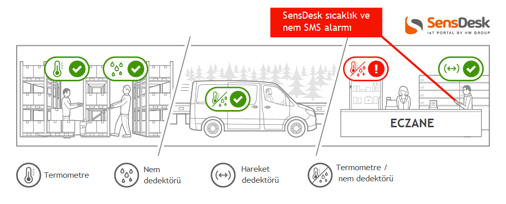 Eczaneler ve sağlık kurumlarının birçok standart ve düzenlemeye uymaları gerekmektedir. SensDesk ile sıcaklık, nem ve diğer koşulların güvenli değerlerini kolayca ayarlayabilirsiniz. Ardından, bir sorun olduğunda alarmlar alabilir ve düzenlemelere uyduğunuzu doğrulamak için raporlar da oluşturabilirsiniz.