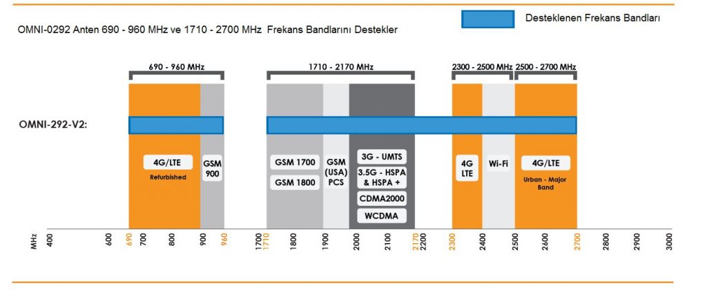 690 – 960 & 1710 – 2700 MHz LTE, 2.5GHz Wi-Fi Bandları