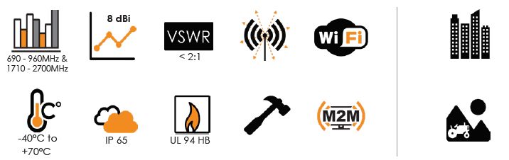 690 – 960 & 1710 – 2700 MHz LTE, 2.5GHz Wi-Fi