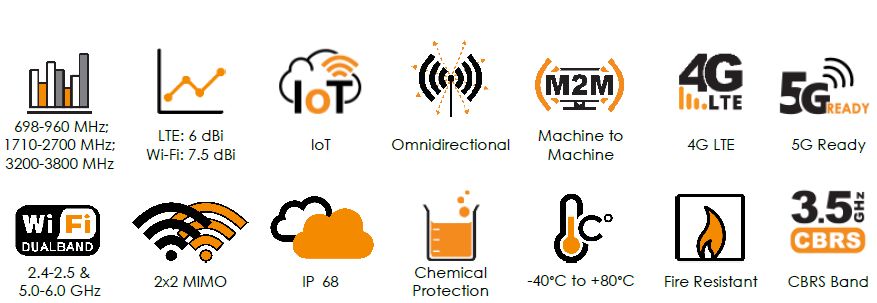 Yüksek kazançlı omni yönlendirilmiş anten LTE (4G) tüm frekans bandları yanında WiFi, HSDPA, 3G, EDGE, GPRS ve GSM/ses frekans bandlarını destekler. Zor koşullar için ideal çözüm sağlayan anten, bina dışı çalışma koşullarına uygundur.