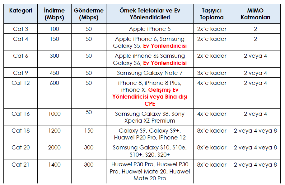 Aşağıda, çeşitli cep telefonlarını ve ilgili UE kategori sınıflarını karşılaştıran bir tablo bulunmaktadır. Ev Yönlendiricileri karşılaştırma için tabloya dahil edilmiştir.