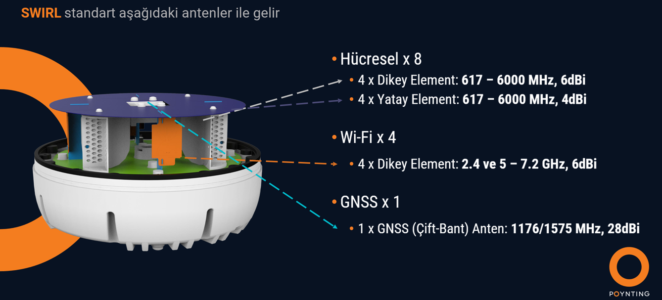 Buna ek olarak SWIRL’da WIFI ve GNSS antenleri de bulunmaktadır. Böylelikle IP69K ve IK08 standardında zorlu ortamlara dayanacak şekilde inşa edilmiş bir muhafazada 13 adede kadar antene (8 x Hücresel, 4 x Wi-Fi ve 1 x GNSS) sahip olursunuz ve çeşitli hava koşullarında bağlantı ve fiziksel güvenilirlilik garanti edilir.