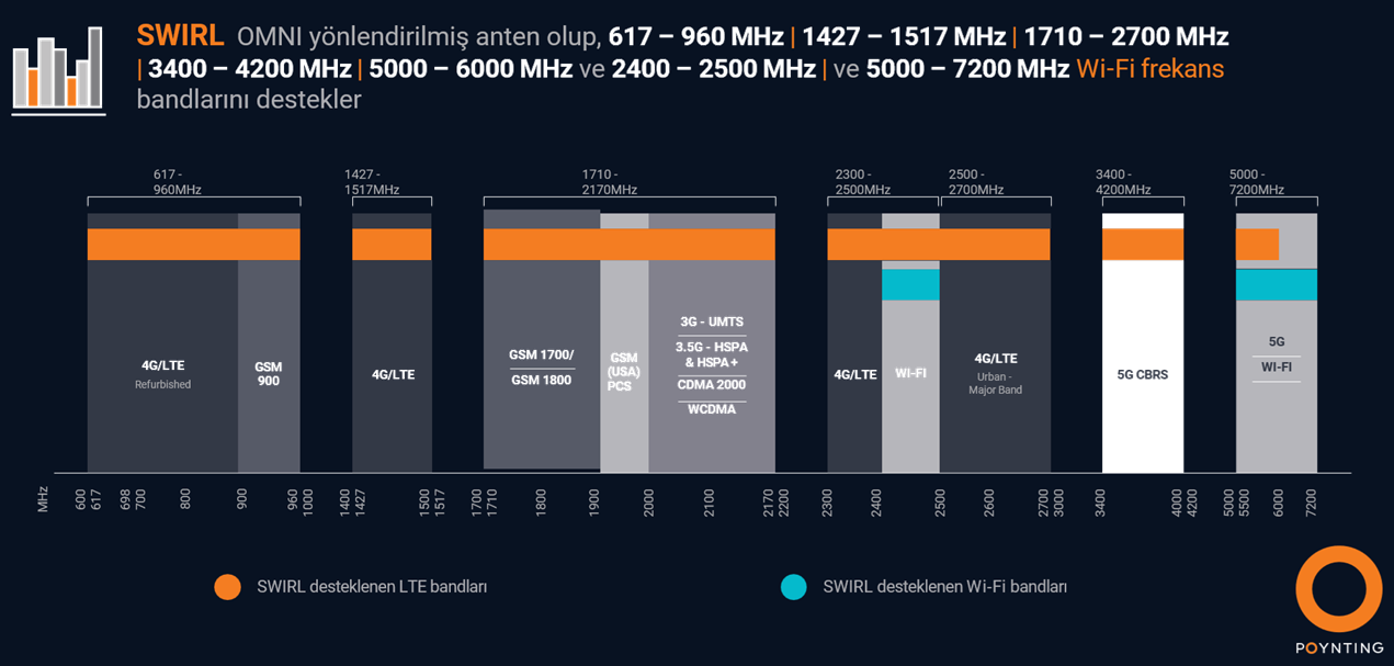 SWIRL, 617 MHz’den 7200’e kadar ultra geniş bant frekans aralığında üstün bağlantı sunan 8×8 MIMO, 5G çapraz polarize (yatay ve dikey) bir antendir. Yatay ve dikey polarizasyon, yalnızca dikey polarizasyona sahip antenlere kıyasla iki kat daha fazla veri hızı sağlar. SWIRL, her iki polarizasyonu da sağlayan tek üründür!
