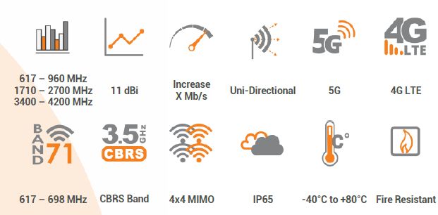 Yüksek kazançlı 11 dBi, çapraz kutuplu 4xMIMO panel anten 5G|LTE|(4G) tüm frekans bandları yanında HSDPA, 3G, EDGE, GPRS ve GSM/ses frekans bandlarını da destekler. Sağlam yapısının yanında her türlü koşullarda bina içi/dışı çalışabilme özelliği ile özel çalışma koşulları gerektiren endüstriyel, M2M, ATM uygulamaları, yüksek verimli video aktarımları için ideal bir çözüm sağlar. Dört adet SMA konnektör çıkışları ile kolay bağlantı sağlanır.