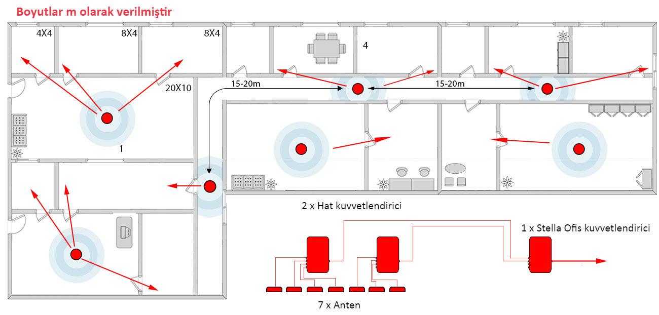 Aşağıda tipik anten düzenini gösteren örnek bir plan verilmiştir. Sinyalin ahşap kapılardan geçeceğine dikkat edin.