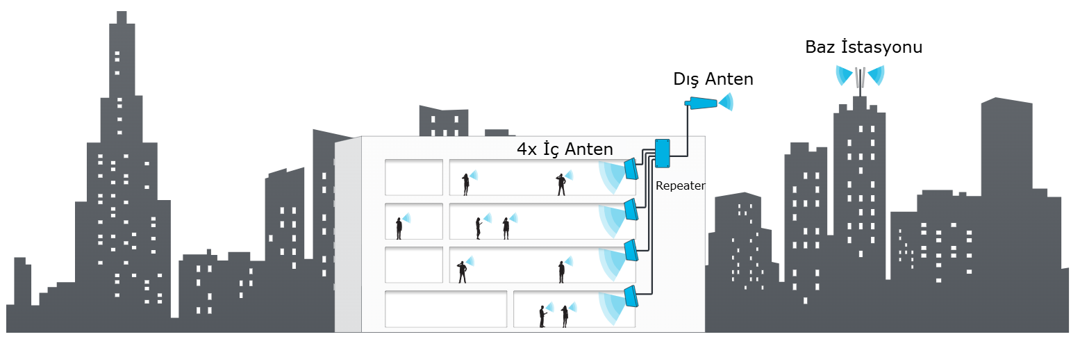 Bu güçlü tekrarlayıcı, odanın boyutuna ve şekline bağlı olarak kapsama alanını 5 ila 15 dahili odaya çıkarmaya olanak sağlayan 4 porta sahiptir. Bu 4 adet porta 4 adet iç anten bağlanır.